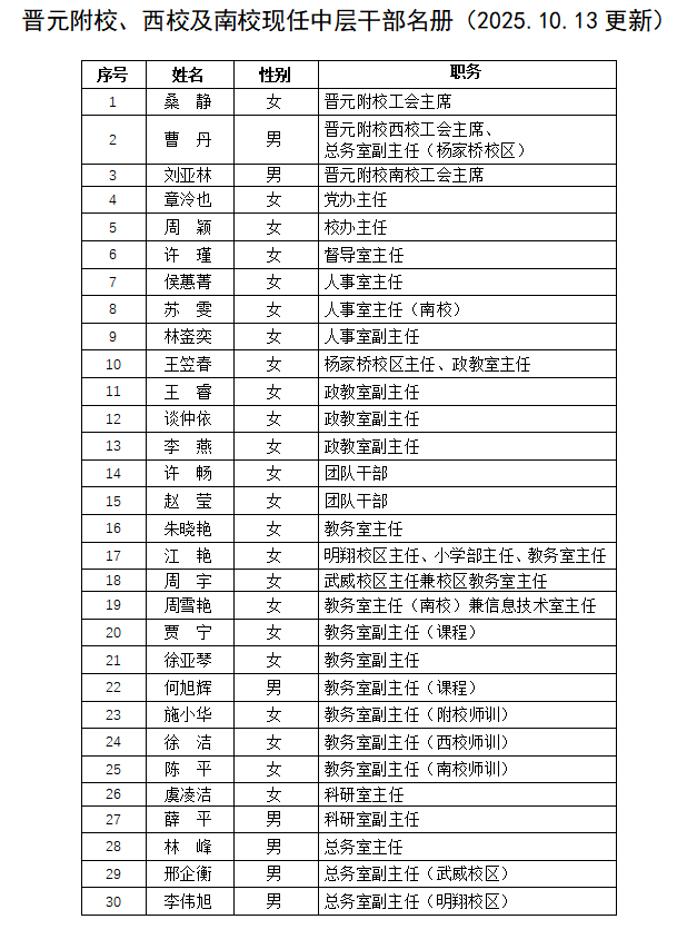 晋元附校、西校及南校现任中层干部名册(2025.10.13更新)
