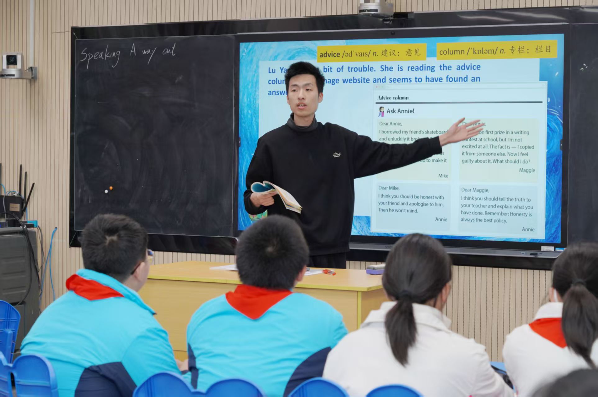 活动开场,晋元附校的青年教师廖天昀带来七年级第四单元口语研讨课《A way out》。廖老师紧扣 “诚实守信” 主题,引导学生理解对话类语篇结构并进行交流实践。说前阶段,学生通过阅读标题情境,明确对话任务,理解对话语篇“道歉-解释-解决”的行为结构与主持人建议之间的关联,理解对话语篇“道歉-解释-解决”的行为结构与主持人建议之间的关联,形成正确的解释和接受解释内容;说中环节,学生依据所学内容及给定情境,以对话的形式完成角色扮演;说后阶段,学生反思并分享感悟,根据讨论,批判性地进行反思和修改,并认识诚信的意义,感悟诚信的可贵,内化为行为态度,追求正直诚信的优秀品质,提升责任意识,树立正确的价值观,培养积极的人生态度,促进自我成长。