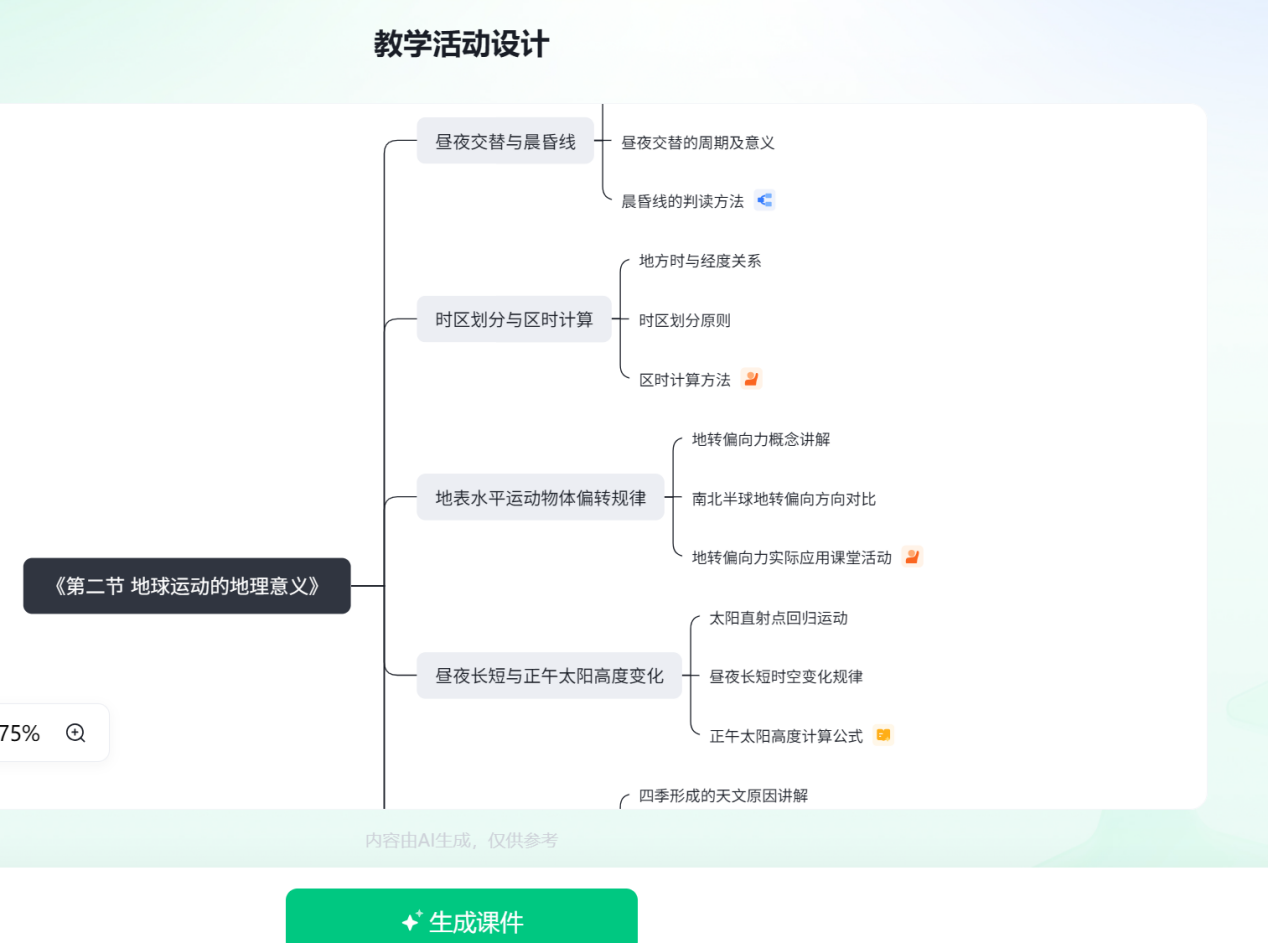 输入课题《地球公转》后,AI仅用30秒便生成一份含6大环节、18个子活动的完整教学流程,“目标—重难点—活动—评价”链条清晰,为后续深度教研赢得大量时间。