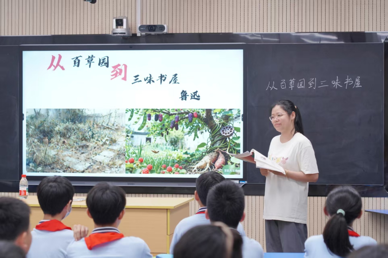万里实验学校的张刘頔老师执教了《从百草园到三味书屋》一课。她从两张图片导入,激发学生的学习兴趣,随后引导学生走进“百草园”寻找童趣,再步入“三味书屋”体会其中的严肃与乐趣。整堂课不仅帮助学生理解了鲁迅回忆中蕴含的复杂情感,也让他们初步感知《朝花夕拾》“温馨回忆与理性批判”相结合的独特风格,体会到童年经历对个人成长的意义。