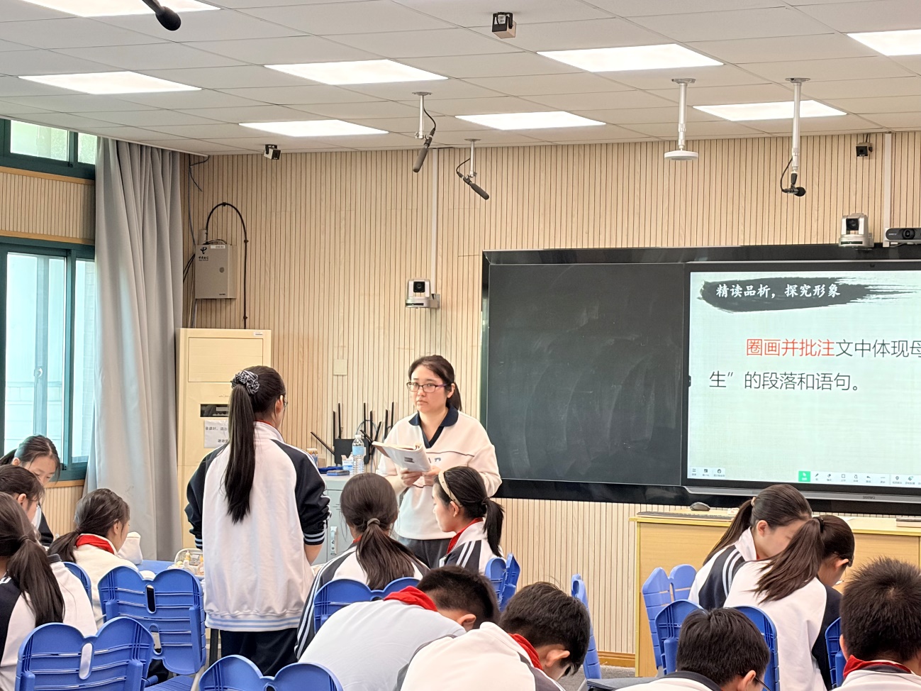 活动伊始,七年级组杨贺琰老师带来了一节精彩的新课标优课堂展示课——《回忆我的母亲》。杨老师以其扎实的教学功底和清晰的教学思路,引领学生深入文本。她别具匠心地将时代背景知识自然融入了对“朱德母亲”形象的分析中,通过呈现1944年延安追悼大会的历史场景与毛主席的挽联,让学生在一个真实而崇高的情境中,深刻感悟人物品质。