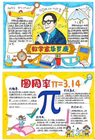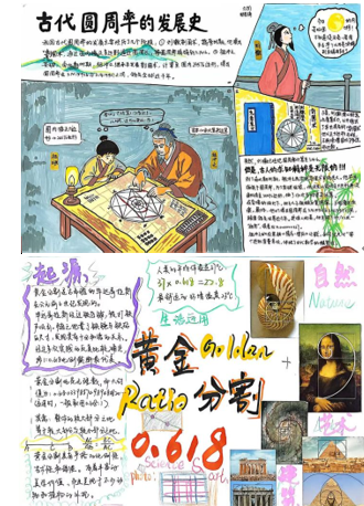 其中,4份一等奖作品尤为亮眼,既展现了扎实的数学功底,又体现了丰富的创意,赢得了师生的一致好评。《古代圆周率的发展史》以漫画形式“穿越”回魏晋与南北朝,生动还原刘徽钻研“割圆术”、祖冲之与儿子在油灯下演算至24576边形的场景,将圆周率的精度突破史变成了鲜活的故事,让古人的求知精神跃然纸上;《黄金分割》小报则串联起毕达哥拉斯的发现、0.618在建筑艺术中的应用,从鹦鹉螺的螺旋纹到《蒙娜丽莎》的构图,将数学的“美”融入自然与艺术的细节中;《圆周率》不仅梳理了从阿基米德到现代计算机的π值演进史,还分享了背诵π的吉尼斯纪录等冷知识,让圆周率多了几分灵动与趣味;《数学家华罗庚》作品则以图文结合的形式,清晰呈现了华罗庚在解析数论等领域的成就,将科学家的钻研精神转化为可感知的榜样力量。