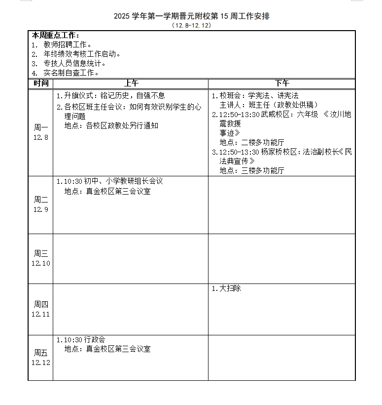 2025学年第一学期晋元附校第15周工作安排
