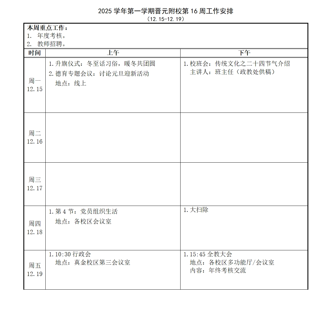 2025学年第一学期晋元附校第16周工作安排