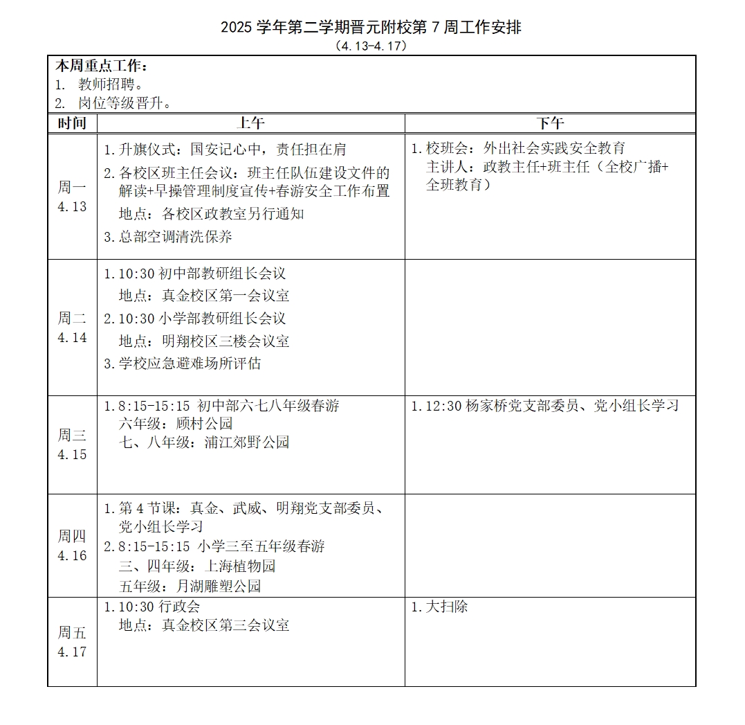 2025学年第二学期晋元附校第7周工作安排