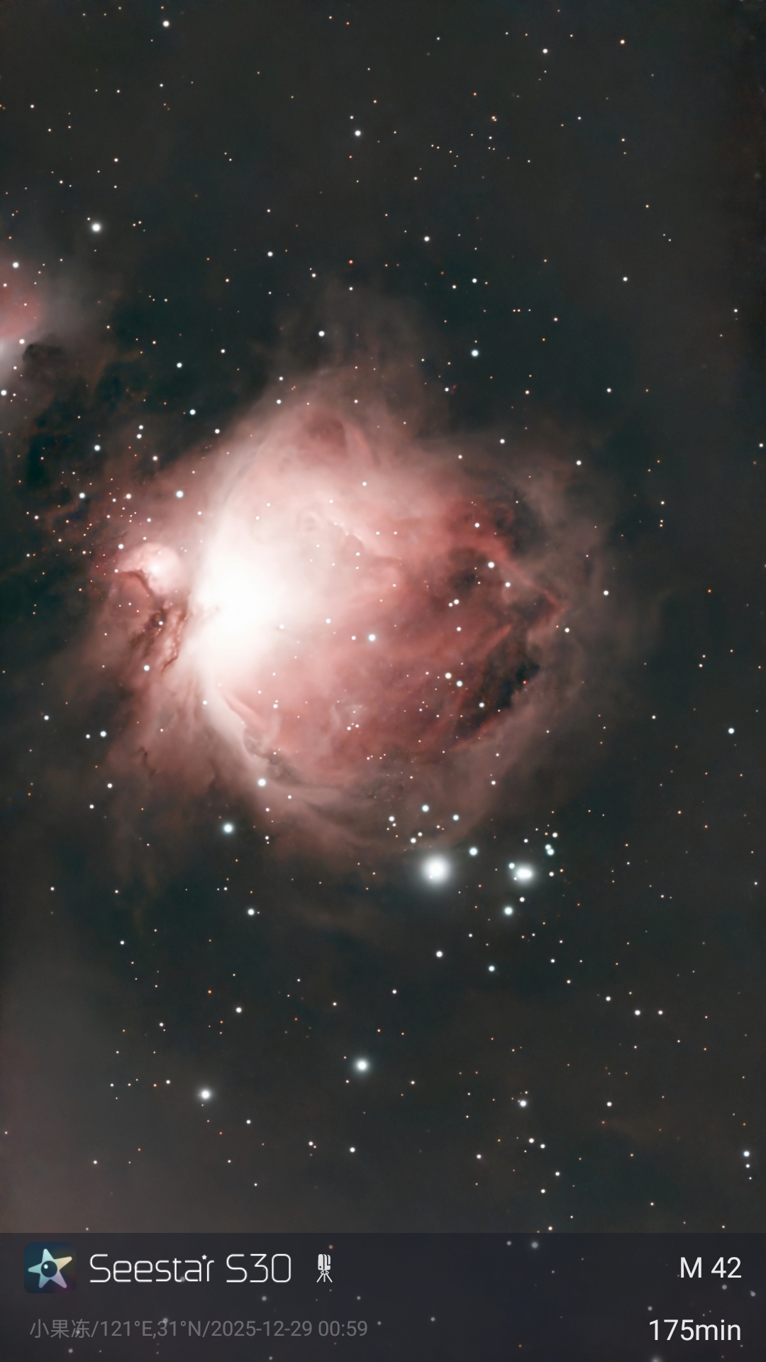 有趣的是,玫瑰星云照片上出现了几道红色线条——那是飞机航行灯留下的轨迹。这“不完美”的痕迹,却意外地创造出一幅融合了人类科技与宇宙深空的浪漫画面。
